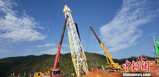勐崗河懸索跨越北岸塔架吊裝作業(yè)現(xiàn)場(chǎng)。華昱翔攝