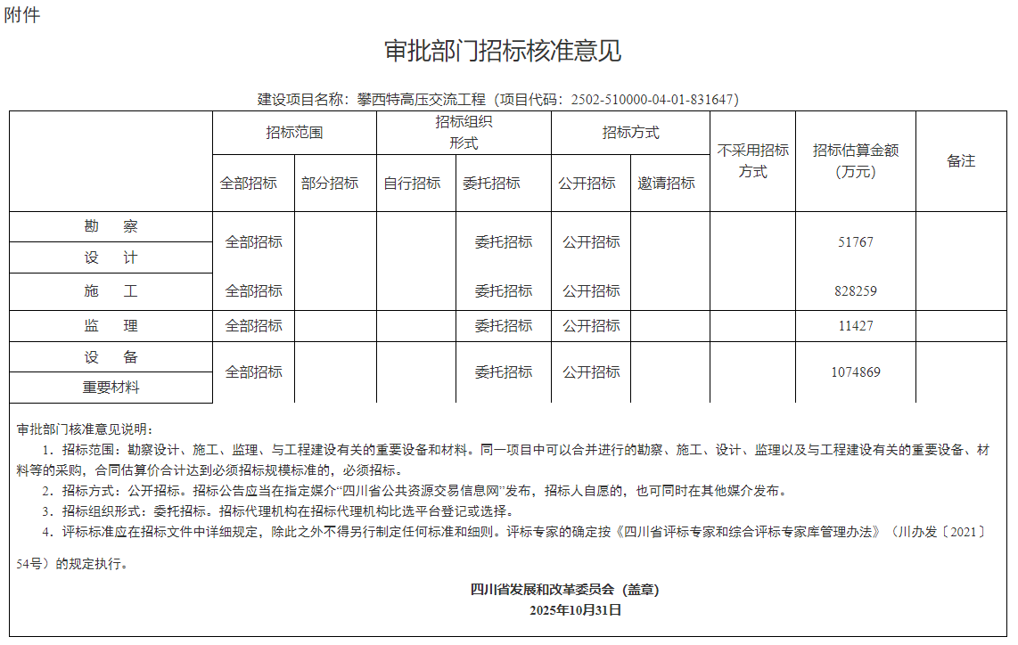 報來《關于呈批核準攀西特高壓交流工程的請示》(川電發展〔2025〕181號)收悉。經研究,現將攀西特高壓交流工程(項目代碼:2502-510000-04-01-486846)核準事項批復如下: