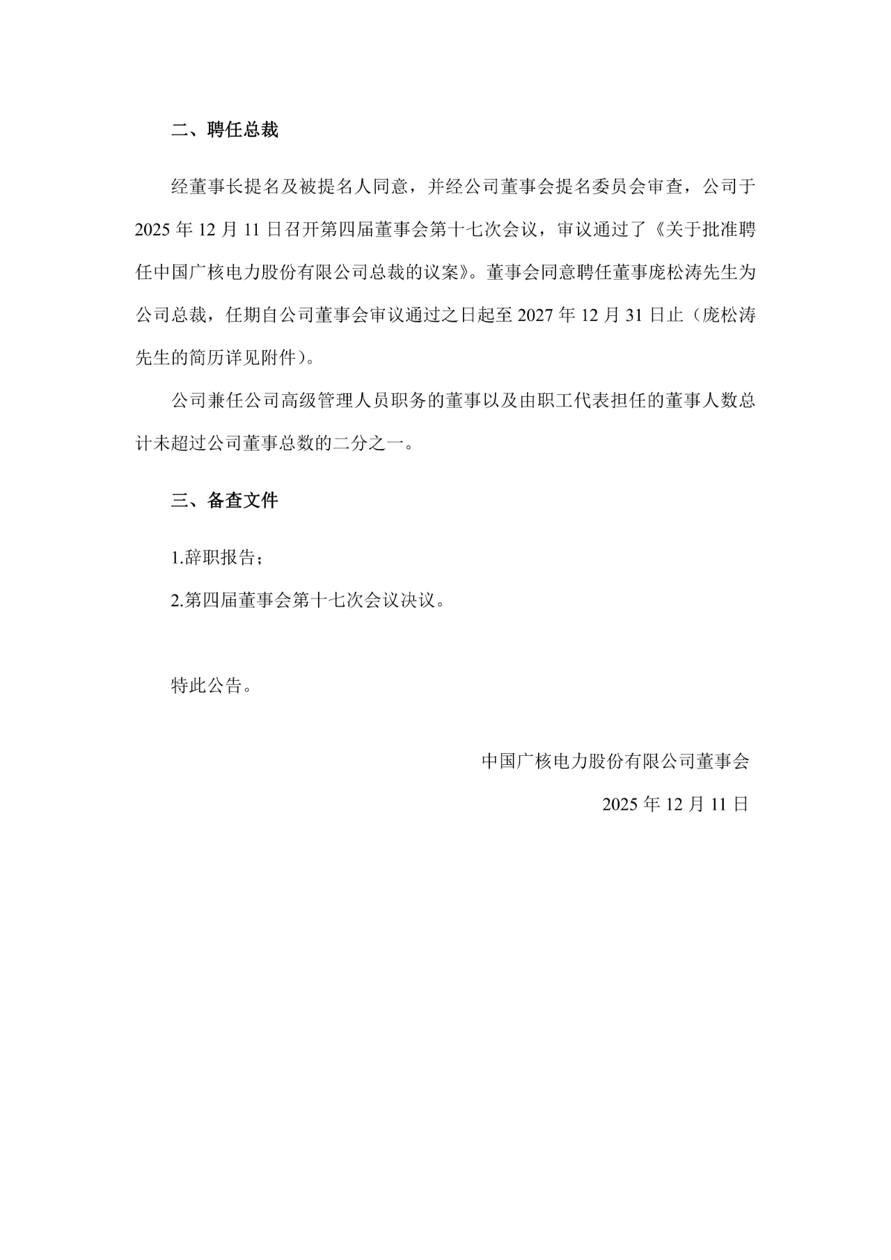 12月11日,中國廣核電力股份有限公司(證券簡稱:中國廣核)召開第四屆董事會(huì)第十七次會(huì)議,審議通過《關(guān)于批準(zhǔn)聘任中國廣核電力股份有限公司總裁的議案》,同意聘任董事龐松濤先生為公司總裁,任期自公司董事會(huì)審議通過之日起至2027年12月31日止 。