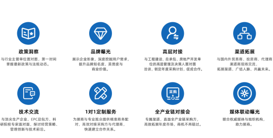 央企及地方總包商參與度高,供采雙方對接、采購觀展團,特邀EPC工程總承包單位洽談區內對接。組織以集團為單位的采購觀展團。提前登記采購單位擬在建工程項目、工程采購計劃需求;提前提供展商展品宣傳;現場VIP采購單位宣傳冊,通過采購方調研反饋,為展商提供更高附加值的專屬服務;提前調研采購單位考察供應商意愿,展后按計劃有序安排,為展商提供增值服務。