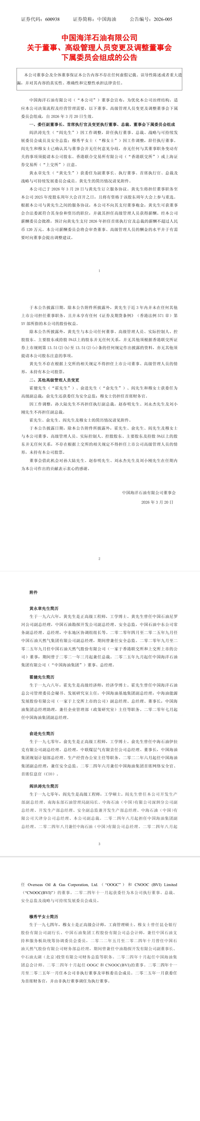 3月20日,中國海油(600938.SH、00883.HK)對外宣布多項管理層人事調整。其中,黃永章獲委任為中國海油副董事長、執行董事、首席執行官、總裁及戰略與可持續發展委員會成員。