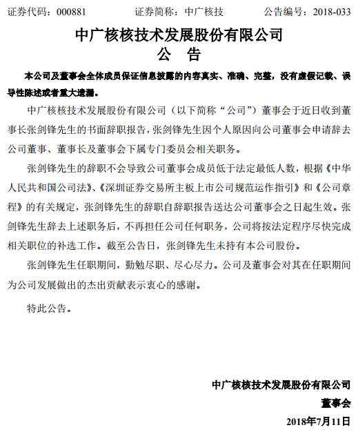 中廣核技:張劍鋒辭去公司董事、董事長
