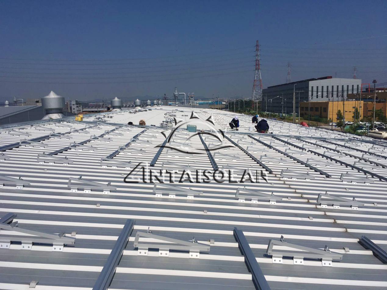 仁川港項目的屋頂類型為梯形彩鋼瓦,包含東西方向傾斜屋頂和南北方向傾斜屋頂,針對不同角度的屋頂,為了實現發電效率最大化,安泰工程師提供四種安裝解決方案,其中包括3種不同角度的三腳架;梯形夾具 + 三腳架 的支架方案在設計上極大地簡化了安裝步驟,從而大幅提升安裝效率,并且很大程度上為客戶減少了運輸和倉儲成本。