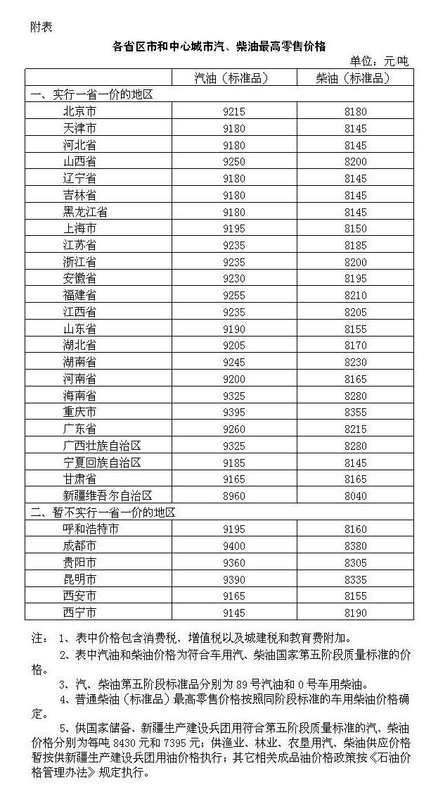 附:各省區市和中心城市汽、柴油最高零售價格