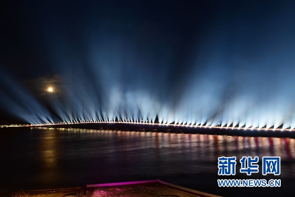 這是8月30日拍攝的點亮燈光的中馬友誼大橋。(圖片來源:新華社 杜才良攝)