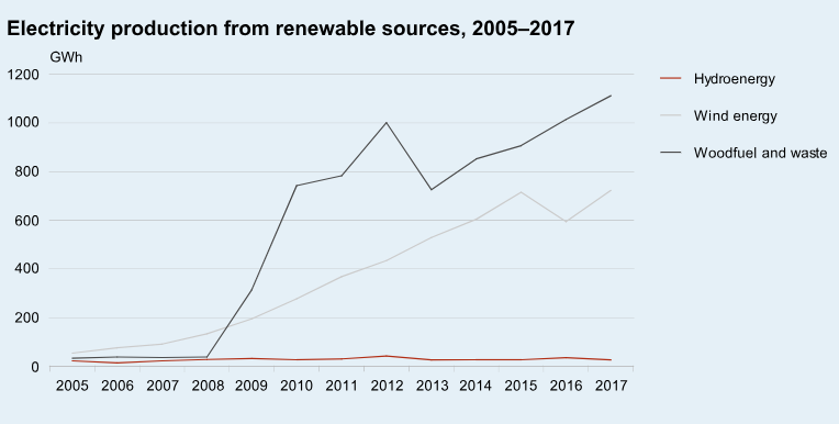 可再生能源的電力生產(chǎn)逐年增加,2017年的增長(zhǎng)率與2016年相比增長(zhǎng)了13%。風(fēng)電產(chǎn)量同比增長(zhǎng)15%,占可再生電力總產(chǎn)量的近40%。木質(zhì)燃料和其他可再生能源的電力生產(chǎn)顯著增加(10%)。