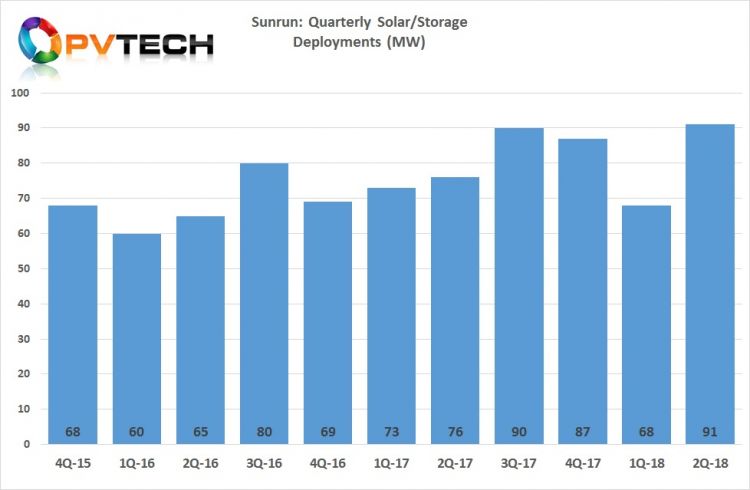 雖然季節性在部署和收入確認方面發揮了作用,但Sunrun的太陽能屋頂部署已從2016年第二季度的65MW增加到2018年第二季度的91MW。
