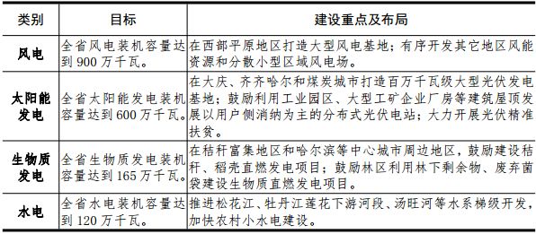 3.積極發展可再生能源風電。風力發電重點布局向我省西部地區轉移,利用西部地區鹽堿地、沙化地等未利用地豐富優勢和電力消納能力較強優勢,優先開發、集中打造大型風電基地。在加強生態保護前提下,有序開發東部等其他地區風力資源。因地制宜提高風能利用效率,積極開展分散式風電試點示范。到2020年,全省風電裝機容量達到900萬千瓦。太陽能發電。大型太陽能電站重點布局在我省中西部鹽堿地等未利用土地和東部四煤城采煤沉陷區,集中打造齊齊哈爾、大慶、綏化和東部四煤城大型光伏發電基地;大力推進光伏精準扶貧,在重點貧困地區推進建設一批村級光伏扶貧電站;鼓勵利用大型公共建筑及公用設施、工業園區等屋頂建設分布式光伏發電。到2020年,全省太陽能發電容量達到600萬千瓦。生物質能發電。統籌規劃、合理布局生物質發電項目。在哈爾濱、齊齊哈爾、佳木斯、大慶等中心城市周邊地區,雞西、雙鴨山、鶴崗、綏化、撫遠及農墾等糧食主產區,規劃布局一批以秸稈和糧食加工剩余物為原料的生物質直燃發電項目;在牡丹江、黑河、伊春等林區,建設一批以林下剩余物、廢棄菌袋等為主的生物質直燃發電項目。加快燃煤與生物質耦合發電關鍵技術研發,選擇有條件的燃煤電廠進行秸稈摻燒改造試點,降低電廠煤耗,減少生物質直接焚燒污染。開展生物質氣化發電、沼氣發電試點示范。到2020年,全省生物質發電裝機容量達到165萬千瓦,年消耗各類生物質資源1300萬噸。水電。在做好生態環境保護和移民安置的前提下,以內河資源為主,按照流域規劃,兼顧經濟和社會效益,堅持梯級、有序、滾動開發,重點加快牡丹江干流蓮花水電站以下江段、湯旺河干流、海浪河干流等流域水電開發建設。加快推進荒溝抽水蓄能電站建設,開工建設尚志、五常抽水蓄能電站,完成依蘭抽水蓄能電站前期工作,提前開展其它優質站址資源的前期工作。到2020年,全省常規水電裝機達到120萬千瓦。