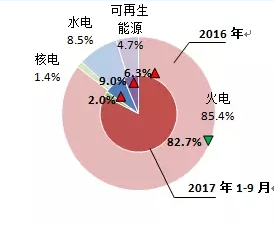 ⊙火電發(fā)電量為6433億千瓦時,同比回落1.8%,占總發(fā)電量的82.7%,份額比2016年減少2.7個百分點;
