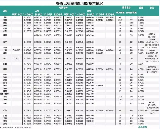 分布式發電市場化交易試點項目中,“過網費”由所在省(區、市)價格主管部門依據國家輸配電價改革有關規定制定,并報國家發展改革委備案。“過網費”核定前,暫按電力用戶接入電壓等級對應的省級電網公共網絡輸配電價(含政策性交叉補貼)扣減分布式發電市場化交易所涉最高電壓等級的輸配電價。各省已核定輸配電價的基本情況如下圖。